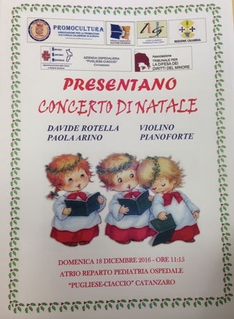 15 Dicembre 2016In occasione dell'imminenza delle festività natalizie, domenica 18 dicembre alle ore 11,15 nell'atrio del reparto di Pediatria si terrà il concerto di Natale organizzato e promosso dall'Istituto Comprensivo "Mater Domini" di Catanzaro e dall'Associazione "Promocultura" di Gimigliano nell'ambito della rete "Mille e una nota" che ha come partner anche il Liceo Classico "P.Galluppi" di Catanzaro e la collaborazione dell'Associazione Tribunale per la Difesa dei Diritti del Minore.