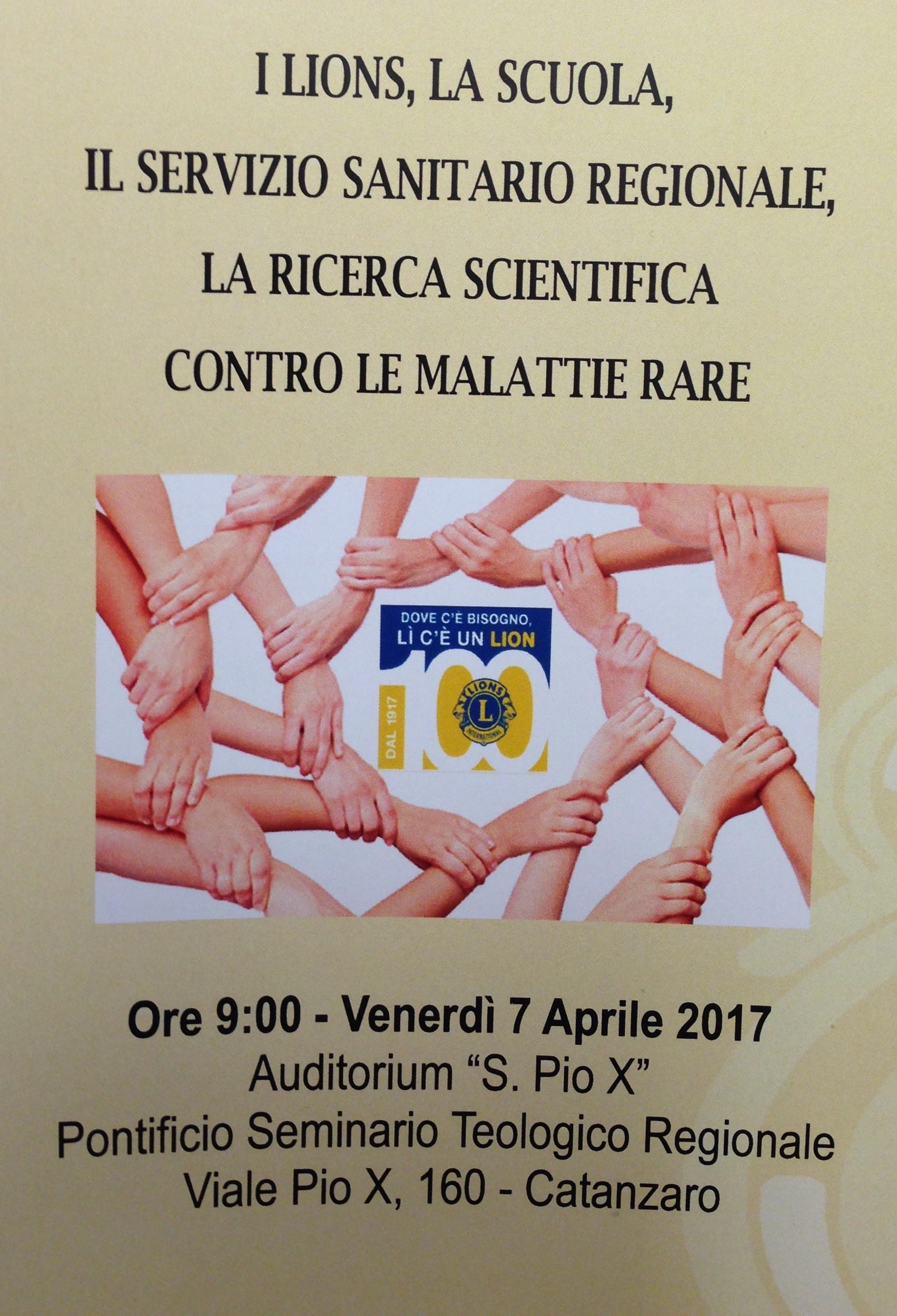 Venerdì 7 aprile presso l'Auditorium "S. Pio X" Pontificio Seminario Teologico Regionale si terrà l'incontro dal titolo "I Lions, la scuola, il servizio sanitario regionale, la ricerca scientifica contro le malattie rare".