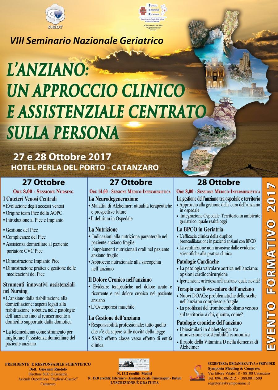L'VIII Seminario Nazionale Geriatrico dal titolo "L'Anziano: un approccio clinico e assistenziale centrato sulla persona" si terrà il 27 e 28 ottobre presso l'Hotel Perla del Porto di Catanzaro.