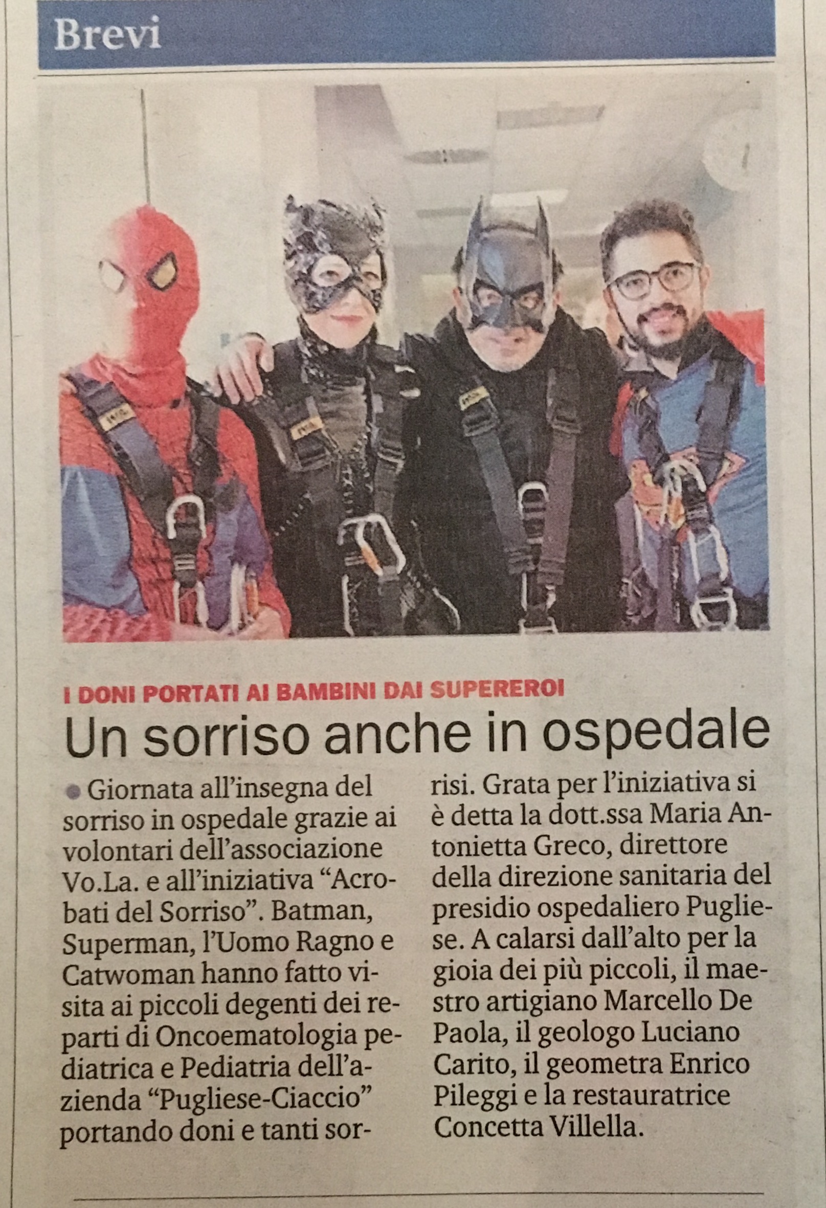 È stata una giornata all’insegna del sorriso al nosocomio grazie ai volontari dell’associazione Vo.La. (Volontari di Lamezia Terme) e all’iniziativa, nata proprio nel mese di dicembre, Acrobati del Sorriso. Batman, Superman, l’Uomo Ragno e Catwoman hanno fatto visita ai piccoli degenti dei reparti di Oncoematologia Pediatrica e Pediatria dell’Azienda Ospedaliera “Pugliese-Ciaccio” portando con se doni e tanti sorrisi.