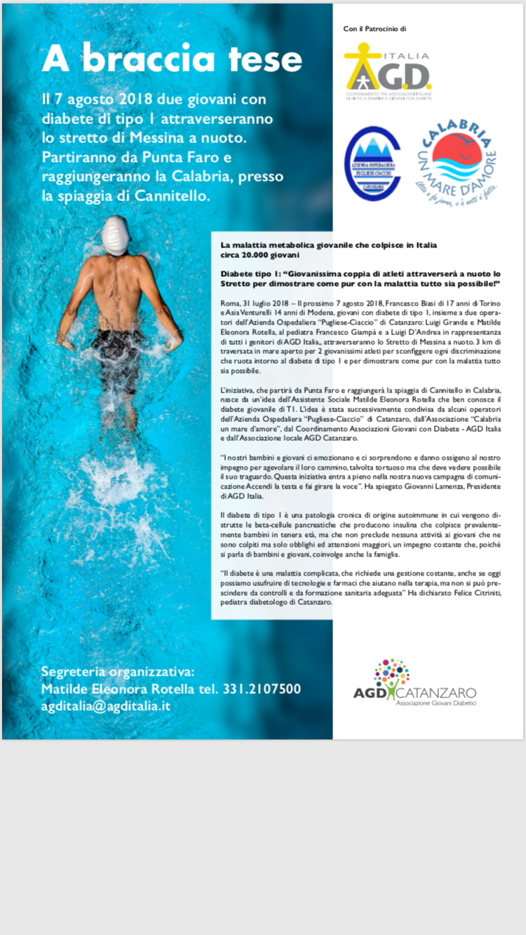 01 Agosto 2018Il prossimo martedì 7 agosto, due giovani con diabete di Tipo 1 attraverseranno lo stretto di Messina a nuoto. Partiranno da Punta Faro e raggiungeranno la Calabria, presso la spiaggia di Cannitello. 3 km di traversata in mare aperto per sconfgiggere ogni discriminazione che ruota intorno al diabete di tipo 1 e per dimostrare come, pur con la malattia, tutto sia possibile.