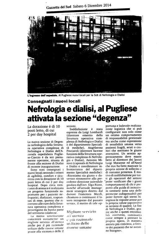 Gazzetta del Sud - Nefrologia e dialisi, al Pugliese attivata la sezione "degenza"