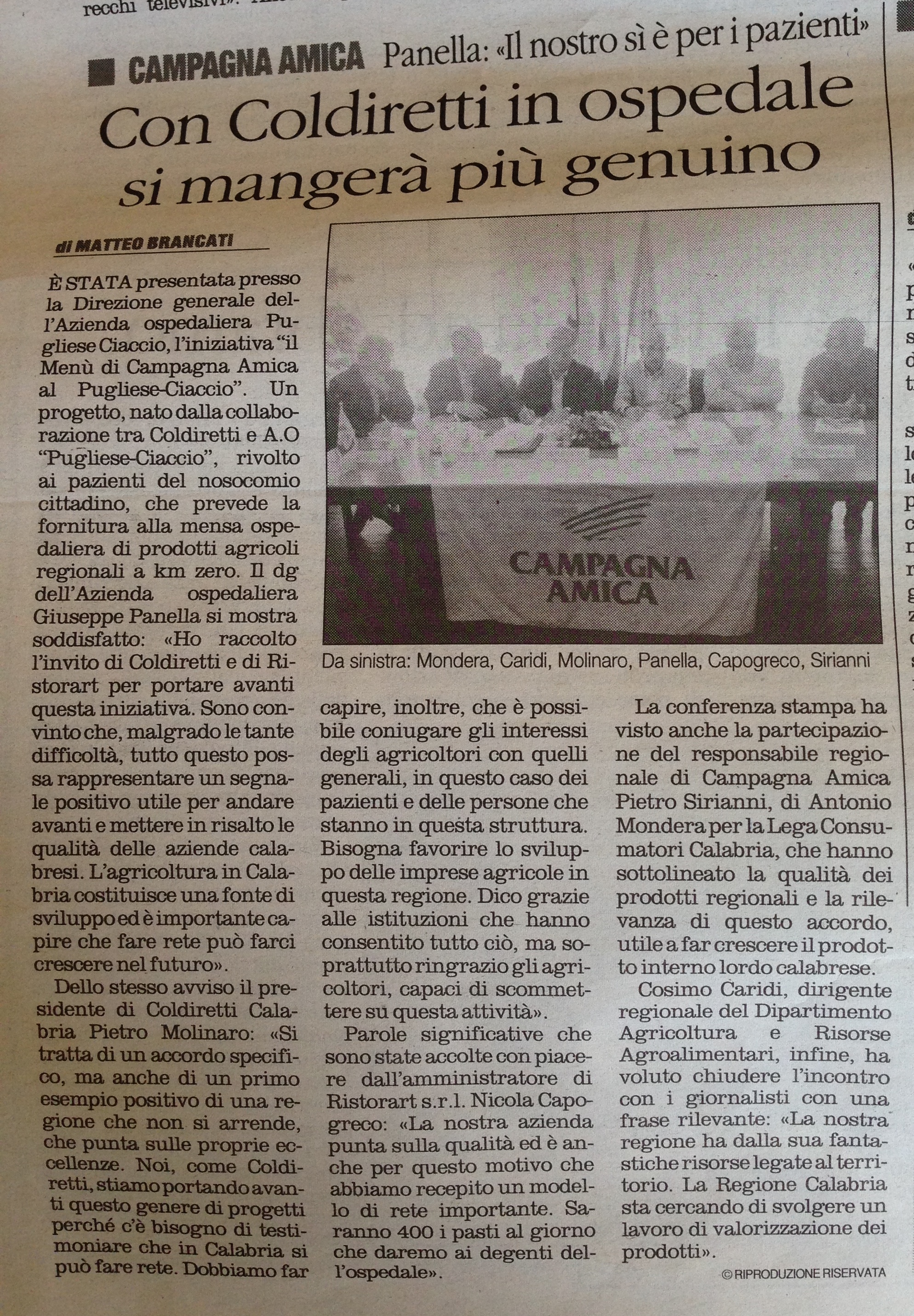 17 giugno 2017 - Il Quotidiano della Calabria - Con Coldiretti in ospedale si mangerà più genuino