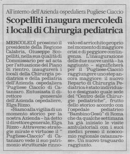 Scopelliti inaugura mercoledì i locali di chirurgia pediatrica - Il Quotidiano 17.07.2012